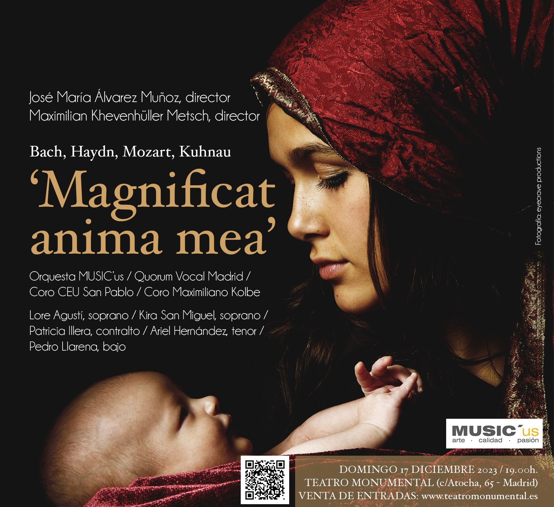 Dieses Jahr wird MUSIC'us zu Weihnachten ein außergewöhnliches symphonisch-chorales Weihnachtskonzert im Teatro Monumental in Madrid, dem Sitz des RTVE-Orchesters und -Chores, geben. Sie findet am Sonntag, 17. Dezember 2023 um 19:00 Uhr statt. Tickets können über die Website erworben werden www.teatromonumental.es.